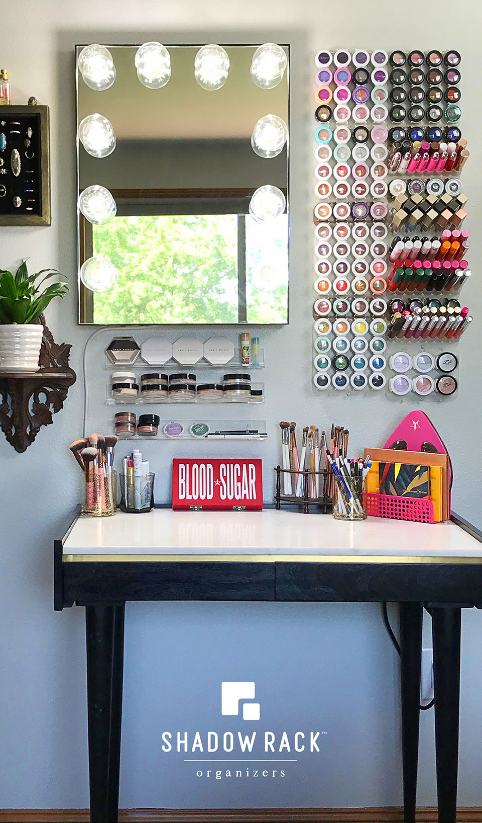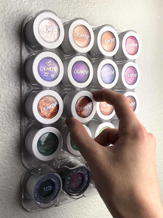 The ultimate goal of makeup storage is to be able to see the things that you have, so you can have fun with the new and shiny stuff, but also be reminded to dip into older favorites and get the most out of your investment. In acrylic organizers and drawers it’s still easy for things to go mentally missing (out of sight out of mind). That’s why I invented Shadow Rack organizers, that can utilize wall space to beautifully display makeup collections.