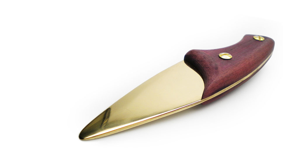 Though CORROSION-RESISTANt and beautiful, brass cannot be hardened by forging like steel, it must be work hardened by brute force and patience. Paired with a hefty, well-balanced handle, and a lustrous finish, this knife is an all-in-one, one-of-a-kind tool.