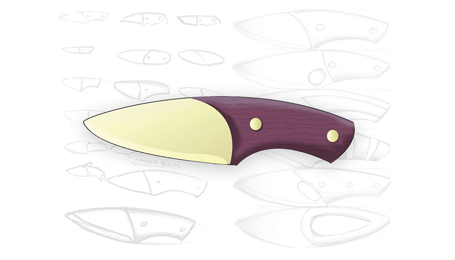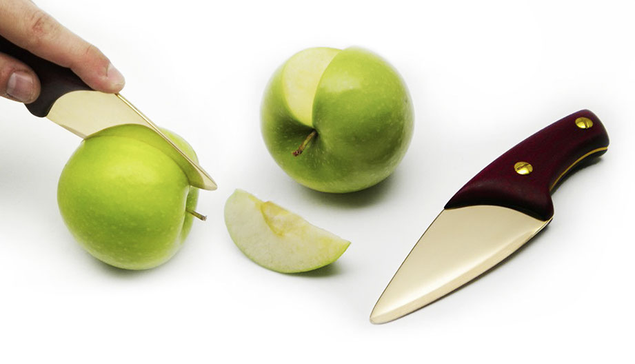 This blade was designed to incorporate the utility of several kitchen tools; a wide surface for spreading, gentle curved edge for slicing, and a deep finger clearance for chopping.