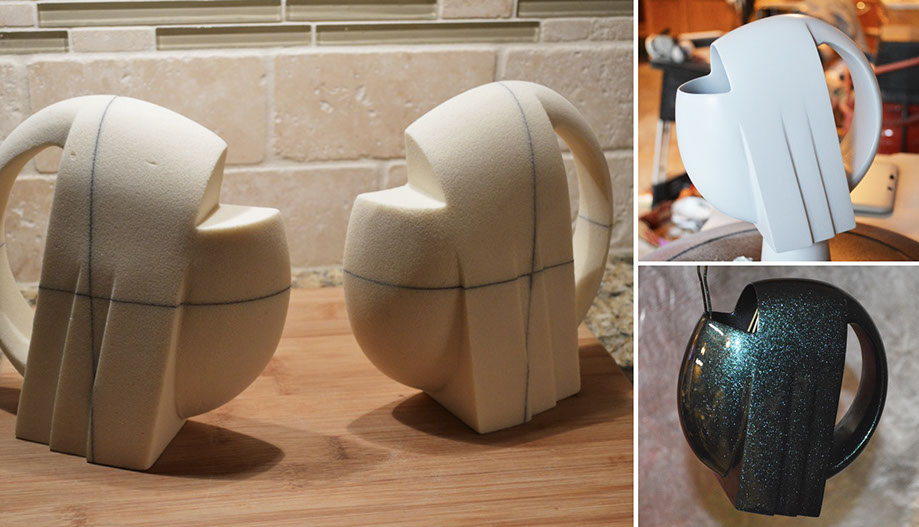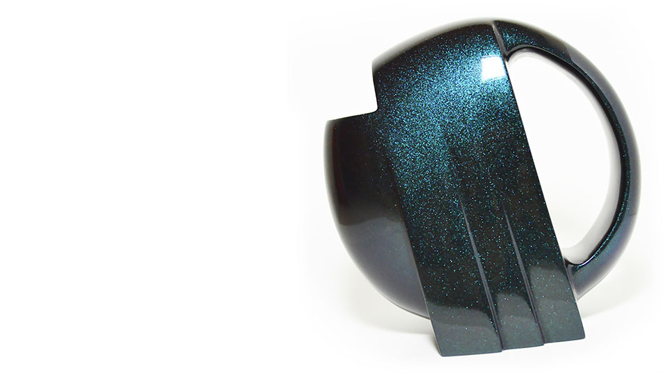 A SLEEk, elegant vessel with abstracted avian influence, the pelican pot, or Pelipot, features clean lines, a stable base, one quart capacity and ergonomic handle polished to a high gloss, iridescent shine. As much an artifact to display as a functional product, the Pelipot was sculpted by hand out of foam in two halves, vacuum-formed and cast out of thermoset polymer resin.