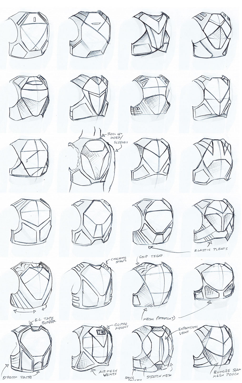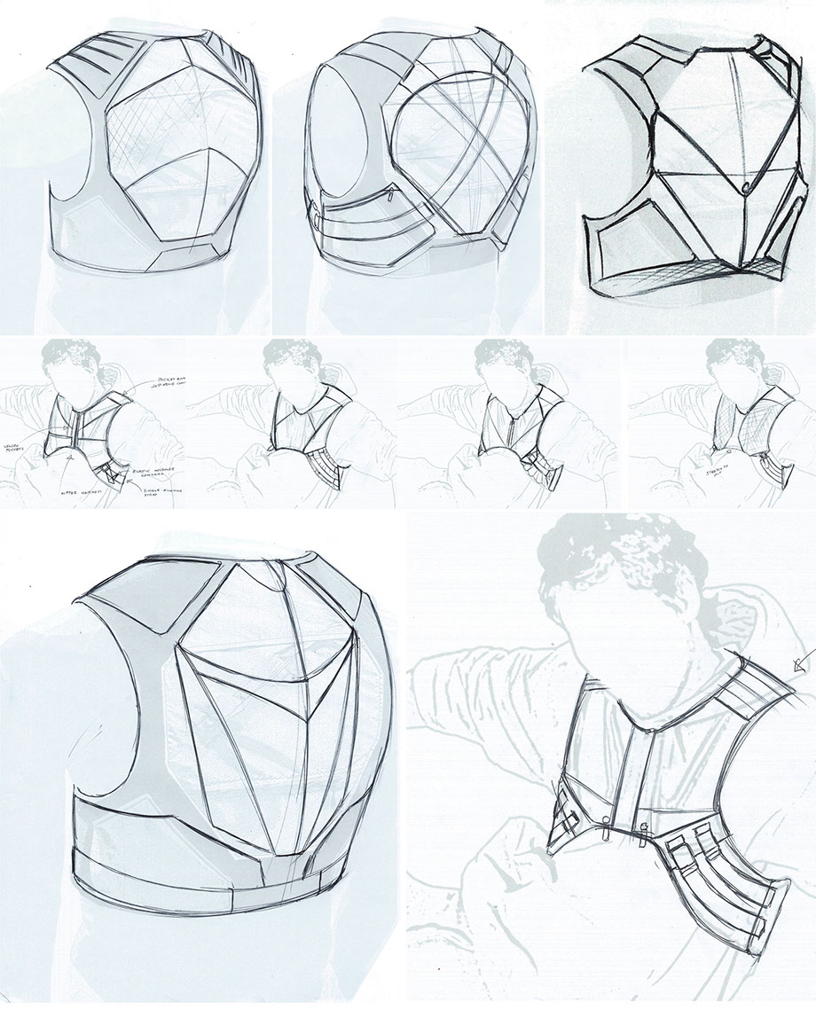 The decided final direction implemented some of the best features and most exciting details from the whole of the refined sketches. A minimal profile, accented edges with different materials breaking up the space, and a slim, fitted harness with elastic components. Further refinements would include reducing complexity and increased visual connectivity of elements and pattern pieces.