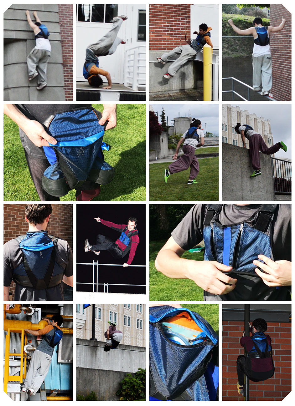 There is an explicit desire among parkour traceurs for a backpack that allows them experience parkour while roving freely through the city, as currently they are shackled to the “park crawl” of a few locations within walking distance of their discarded bags.